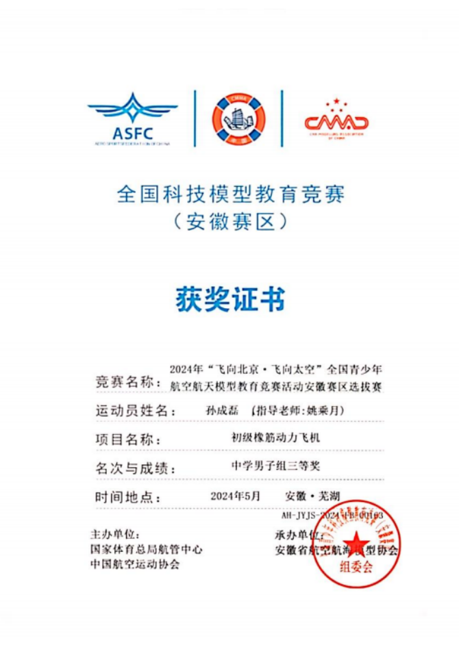 在学校工会主席张德银、八年级部部长姚乘月的带领下,经过激烈角逐,学校学生在初级橡筋动力飞机、电动模型滑翔机、手掷滑翔机直线距离飞行比赛项目上斩获6项省一等奖、7项省二等奖、14项省三等奖。