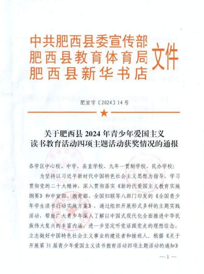 安徽师范大学附属肥西第二中学、附属肥西外国语学校在肥西县2024年青少年爱国主义读书教育活动四项主题活动中斩获佳绩。