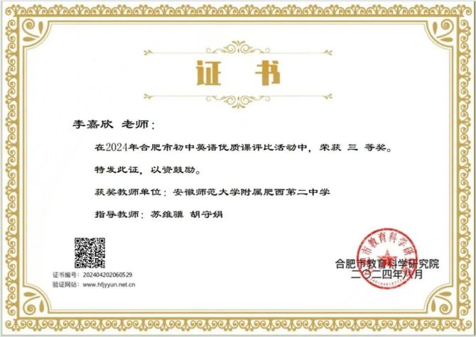 近日,安徽师范大学附属肥西第二中学教师在合肥市优质课比赛中喜获佳绩。其中,程竹红老师荣获初中地理优质课二等奖(指导教师:郑本红 李旭荣),李嘉欣老师荣获初中英语优质课三等奖(指导教师:苏维骥 胡守娟)。