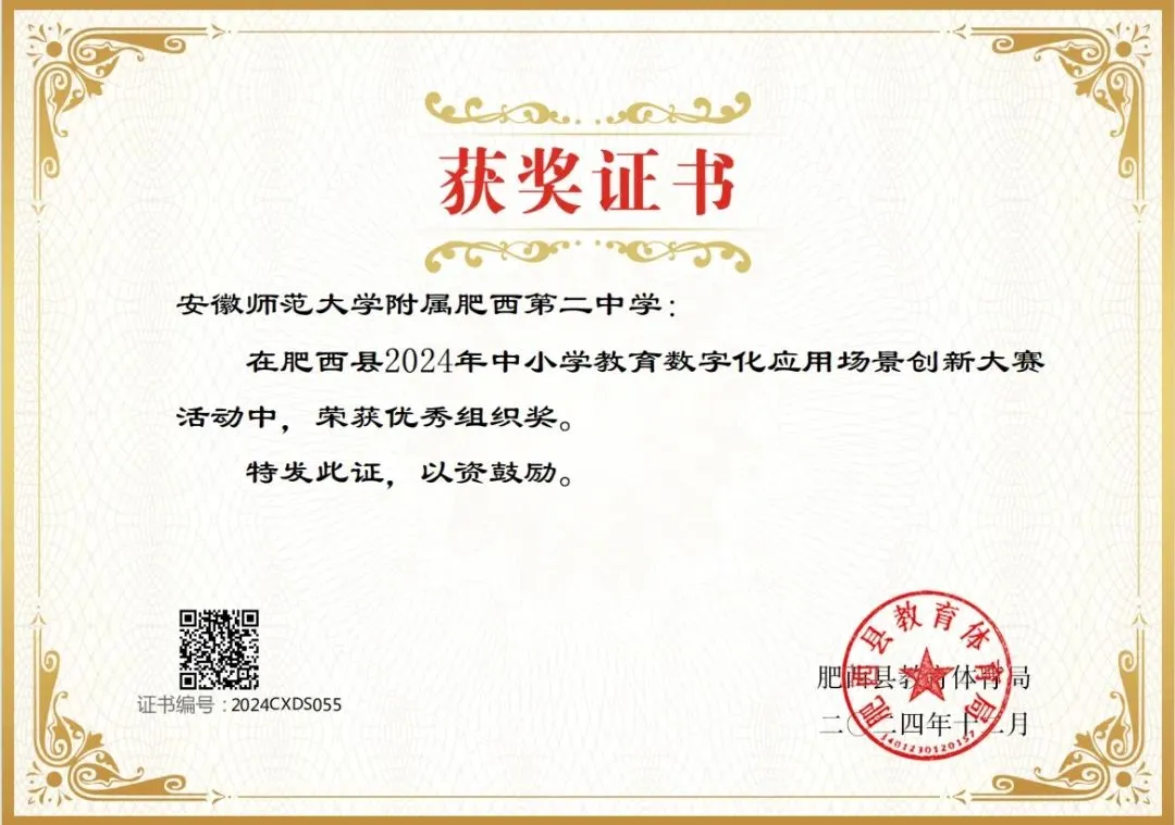 在肥西县2024年中小学教育数字化应用场景创新大赛活动中,安徽师范大学附属肥西第二中学也传来了好消息。该校教师团队在此次大赛中斩获了1个一等奖、2个二等奖和4个三等奖,同时学校还荣获了优秀组织奖。这些获奖作品不仅体现了附属肥西二中教师在教育数字化方面的探索和创新,也为学生提供了更加优质、高效的学习资源。
