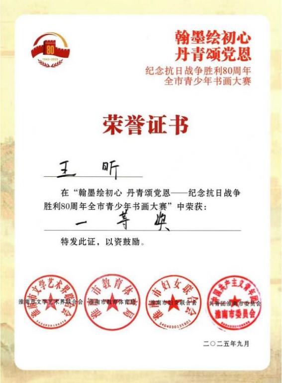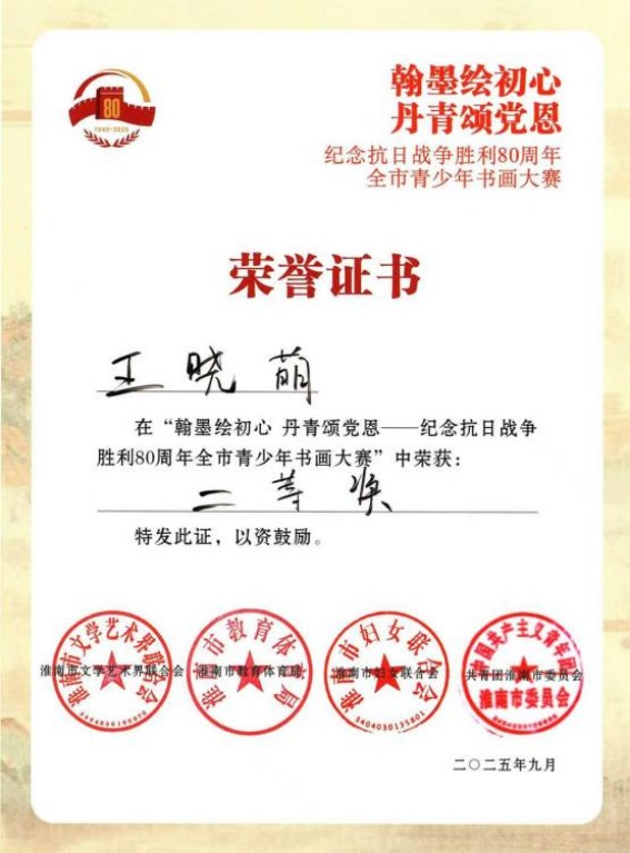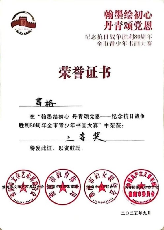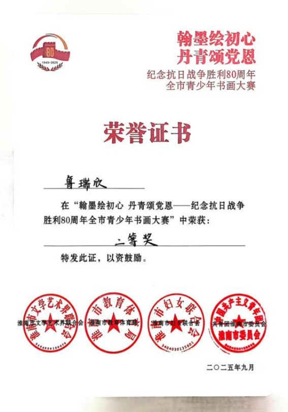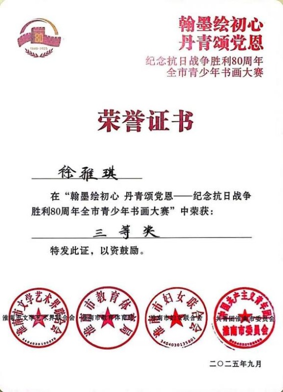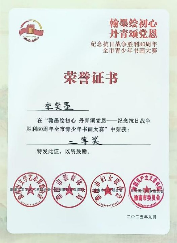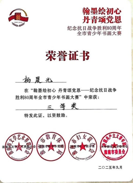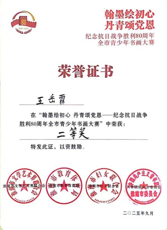 为纪念中国人民抗日战争胜利80周年,传承红色基因,弘扬传统书画艺术,由淮南市青年书法家协会主办的“翰墨绘初心 丹青颂党恩”全市青少年书画大赛评选结果近日揭晓。安师大附属淮南高新学校学子踊跃参与,以笔墨寄情,以书画言志,最终斩获多项大奖,充分展现了学校美育教育和爱国主义教育的丰硕成果!
